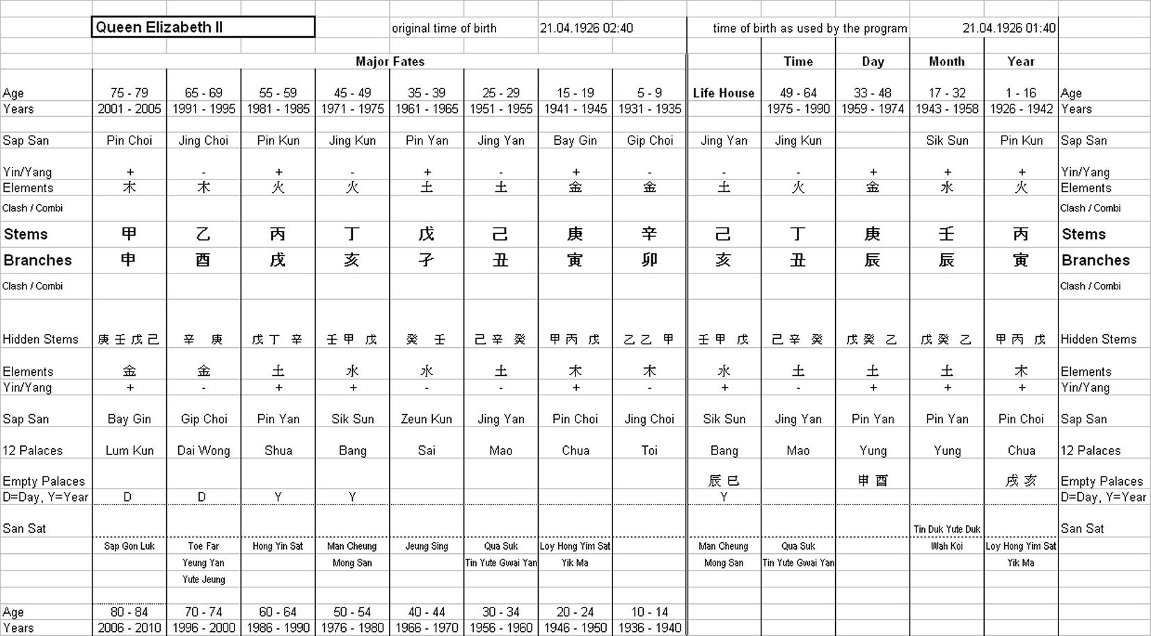 Here you see an overview of all the major information about a horoscope - provided for you to look at and to print it - in just the same way as recommended by Grand Master Chan. Sure to the left you find the remaining fates so that you have all ten together.